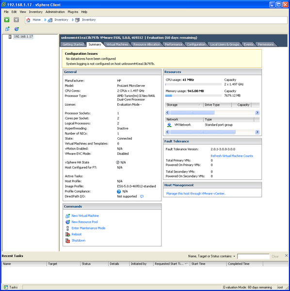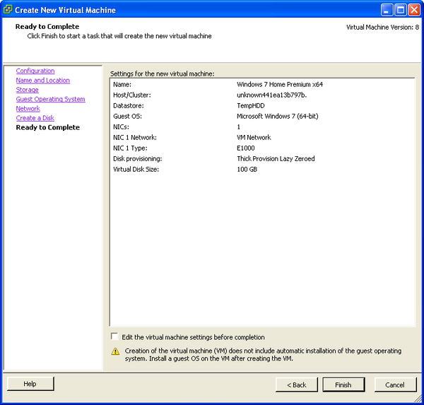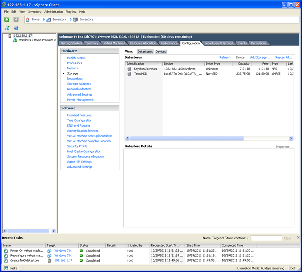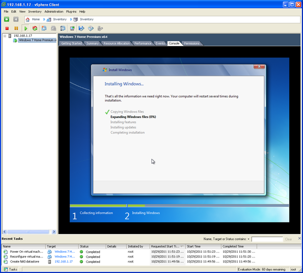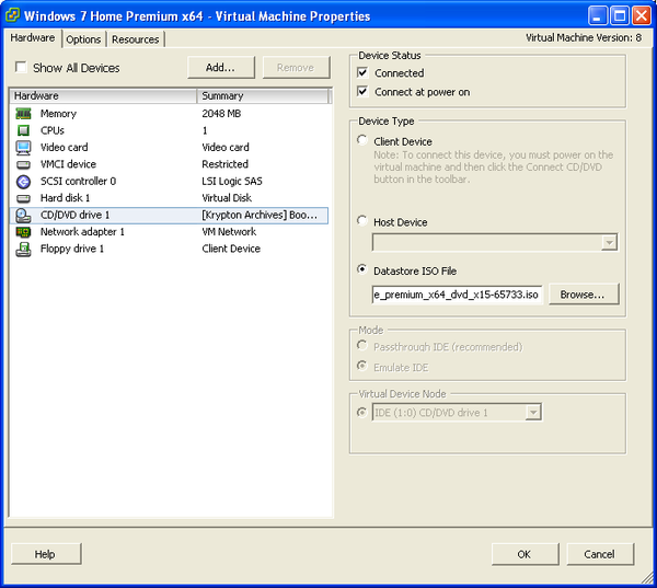 Today I thought I would have a quick crack at installing Win 7 Home Premium x64 via a ISO onto the newly created VM Server. The ISO was on my NAS and the path was shared out as a NFS Share. The process was relatively simple once I had the vSphere client up and running.